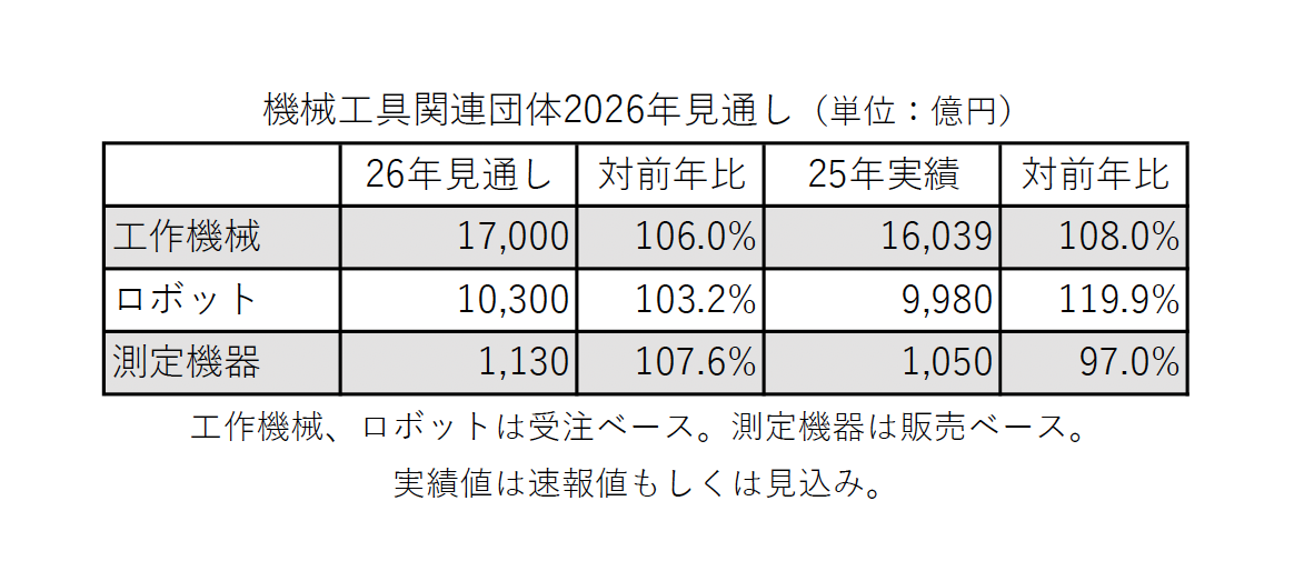 減税も内需を後押し 工作機械、ロボット、測定機器の機械工具関連3団体が2026年の見通しを発表した。工作機械の受注額は前年比6.0%増の1兆7000億円と見通した。ロボットの受注額は3.2%増の1兆300億円と22年以来 […]
