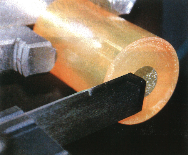 ゴムやウレタン、シリコンゴムなど弾性体のワークを、切り粉を出さずに突切り加工できる旋盤用工具。ゴム加工メーカーから「もっと手軽に誰でも弾性体を加工できないか」というニーズに対応した。