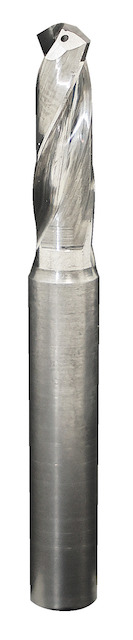 超硬合金本体に多結晶ダイヤモンド焼結体(PCD)を採用し、長寿命かつ高精度・高能率加工を実現。センタースルー構造でねじれ角30度のエアー穴があり、それにより切りくず排出性が向上しノンステップでの穴あけ加工を可能にした。