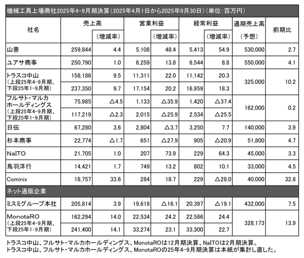 機械工具上場商社の2025年4—9月期決算(トラスコ中山、フルサト・マルカホールディングスは1—9月期、NaITOは3—8月期)が出揃った。自動車の設備投資が依然として鈍いが、人手不足を背景に増加する自動化・省力化需要を開拓した。生成AI向けデータセンターなどで伸びる半導体や製造装置の設備需要も堅調だった。11社のうち9社が増収となった。