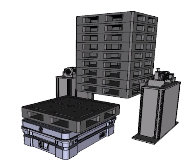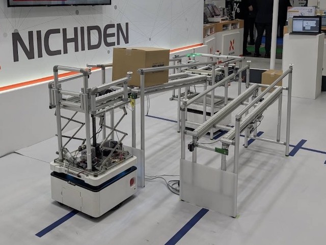 NKE製パレットマガジン(パレット供給システム)とMiR社大型ロボットを連動させたパレットの供給・排出のデモ、画像検査装置とロボットを搭載したAMRによる検査装置へのワーク供給と排出の自動化を披露。