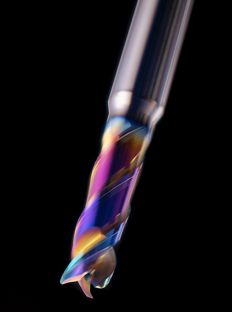 ヘリカル穴加工向けのエンドミル『ドリルミル』は剛性の低い薄板板金の穴あけを目的に開発した。主な特長は独自の底刃形状で切削抵抗を大幅に低減。内部給油で冷却効果と切くずの排出性を向上させたことで切粉トラブル回避、切削速度の向上、工具の長寿命化を実現。異なる径の穴加工や溝加工、側面加工も工具1本に集約できる。