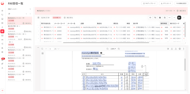 また、従来は発注元が記載した単価をそのまま参照していたファクス注文についても、AI -OCRによって商流や納入先を判別したうえで、マスターデータに基づいた販売価格を自動で計算。