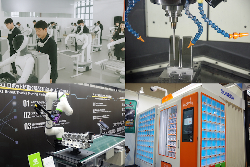 【下】㊧AIロボが移動するワークのねじ締めを行う(ファナック)㊨調達を効率化するためニーズが増えている工具管理システム(曽根田工業)