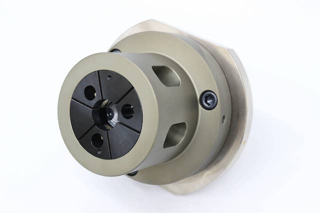 『特殊コレット』はワークの把握径に合わせた幅広いレイアウトに対応。ブレーキドラムなど大型ワークから電子部品の小型ワークまでワークの剛性や加工条件に応じ製作するほか、ロータリーテーブルに搭載する仕様もあり、旋削からフライス加工までの連続加工にも対応できる。