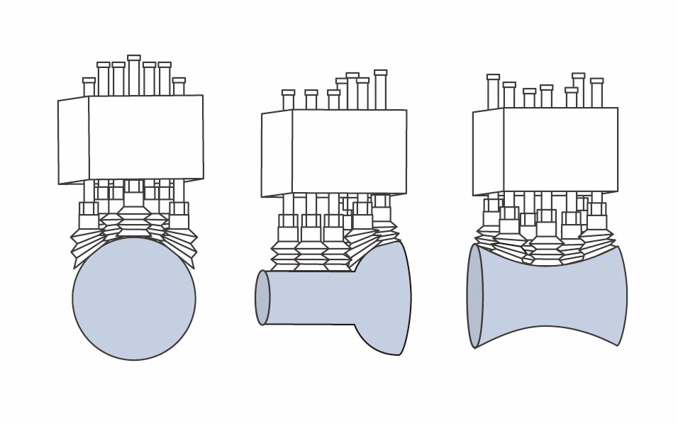 ハンド内部には同社の特許技術「クイッククランパーエレメント」を搭載。ワーク形状に合わせて、空圧制御で各シャフトのストロークを個別に固定する仕組みだ。内蔵する小型ビームセンサーでワークまでの位置を検知し、適切な位置制御も行う。