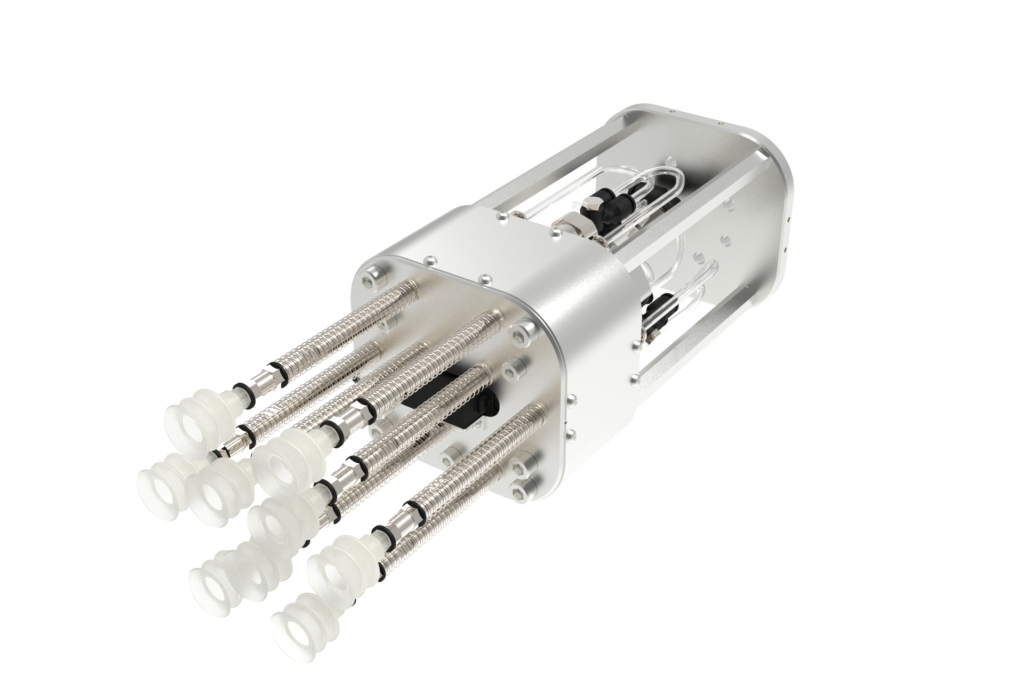 従来の自動搬送工程では、ワークの切り替えに合わせてロボットハンドの交換が必要で、段取り替えが手間になっていた。今回発表した「TNH08-V09」は、9つの吸着パッドをシャフト先端に装着し、ワークの凹凸に対して、吸着位置を自動で最適化する独自機構を採用した。多様なワークに1台で対応する。