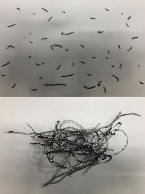 SUS304での切り屑の比較写真。高圧クーラント(14MPa)により分断された切り屑(上)と従来圧力のクーラントによる切り屑(下)